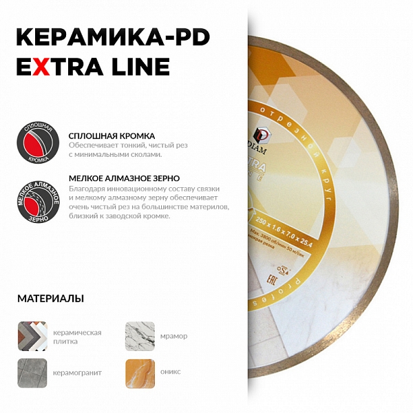 Алмазный отрезной круг Diam Extra Line 1A1R Корона Керамика-PD 250 мм (Диам Экстра Лайн 1А1Р Корона Керамика-ПД 250 мм) – премиальный алмазный диск для мокрой резки различной керамики, мрамора, оникса и других материалов.