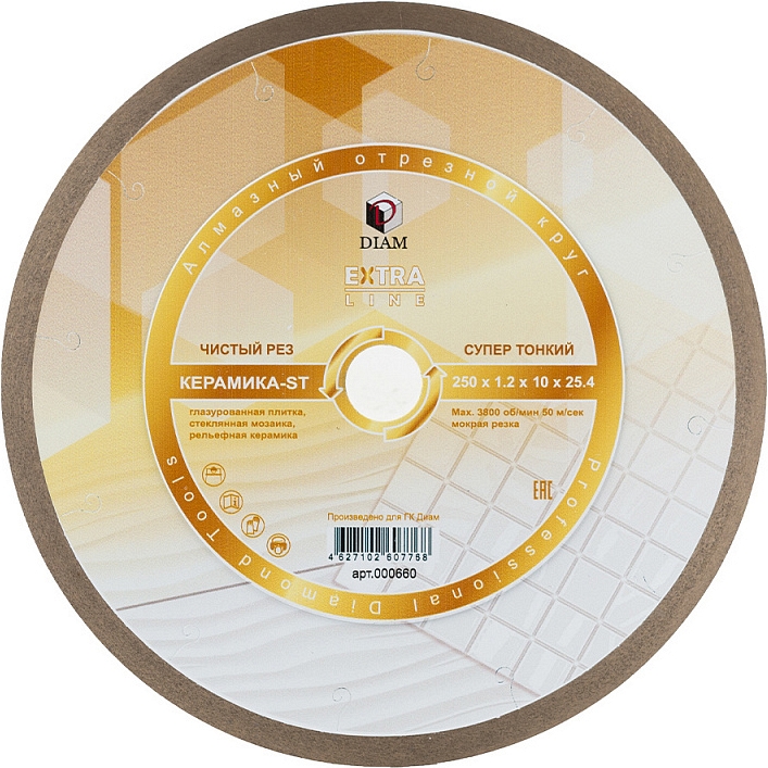 Алмазный отрезной круг Diam Extra Line 1A1R Корона Керамика-ST 250 мм (Диам Экстра Лайн 1А1Р Корона Керамика-СТ 250 мм) специально разработан для качественной резки глазурованной плитки, керамической и стеклянной мозаики, 3-D керамики, керамогранита с рельефной поверхностью на электрических камнерезных станках и плиткорезах с водяным охлаждением. Идеальный алмазный диск для работы с отделочными материалами на основе керамики, стеклянной мозаикой, лейкосапфиром.