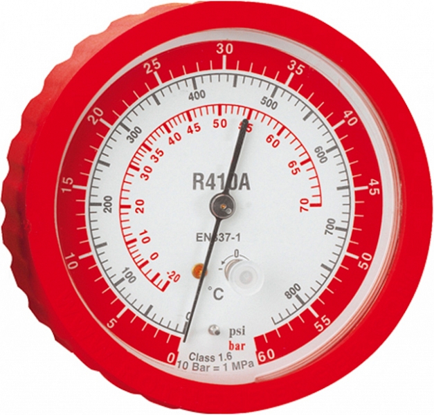 - Ударопрочные манометры низкого и высокого давления для различных хладагентов – 3 различных манометра Pulse-free, класс 1.6, 80 мм: универсальное использование для кондиционеров со всеми распространенными хладагентами, а также в диапазоне высокого давления для R410А