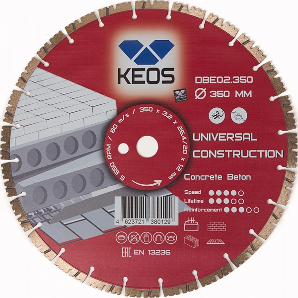 Диск алмазный сегментный Keos Universal Construction 350 мм (Кеос Универсал Констракшен 350 мм) предназначен для резки бетона, железобетона и кирпича на бензорезах, электрических резчиках и плиткорезах, каменерезных станках, стенорезных машинах, швонарезчиках, как с подачей воды, так и всухую.