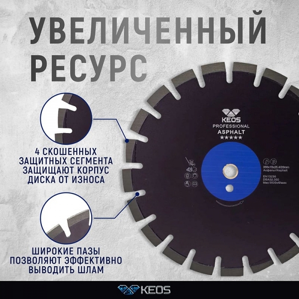 Преимущества диска алмазного сегментного по асфальту Keos Professional Asphalt 350 мм: