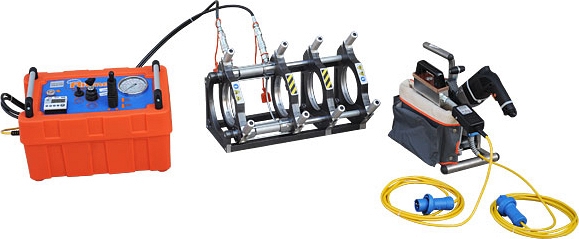 - Электрический гидроагрегат в специальном ударопрочном пластиковом корпусе с рычагом управления сведением / разведением подвижной каретки, клапаном максимально давления (также используется для цикла "с двойным давлением") и выпускного давления, гидравлическими шлангами с быстроразъемными соединениями, манометром и таймером для отслеживания времени циклов стыковой сварки
