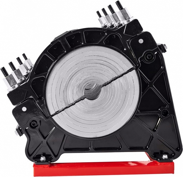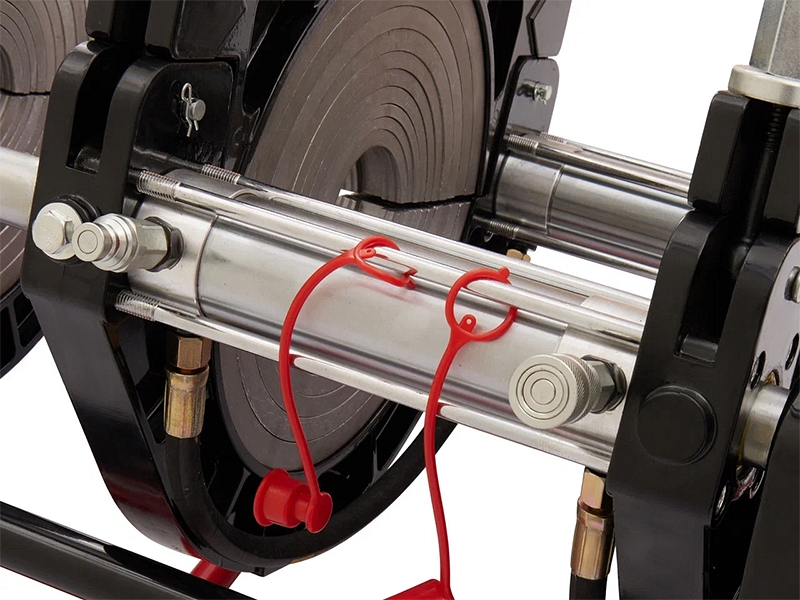 - Центраторо с гидравлическим приводом и 4-мя прочными широкими зажимами, один из которых легко может быть удален для облегчения сварки полимерных фитингов с трубами (тройники, крестовины, отводы), имеет большой запас прочности за счет качественного сплава и ребер жесткости, что позволяет сваривать полимерные трубы с любым показателем SDR