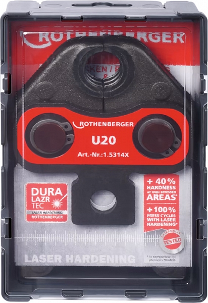 Пресс-клещи Rothenberger Standard U20 (Ротенбергер Стандарт У20) проверенного качества, ориентированные на пресс-фитинговые и трубные системы обжима пластиковых из сшитого полиэтилена (PE-X) и металлопластиковых (МПТ) труб Ø 20 мм различных производителей. Предназначены для аккумуляторных и электрических гидравлических радиальных прессов Rothenberger Romax 4000 / 3000 AC / AC Eco.