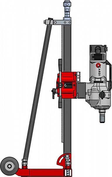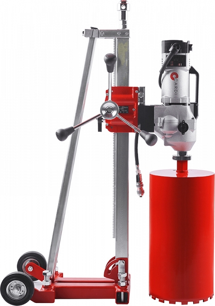 Профессиональная установка алмазного бурения Cardi 306 (Карди 306) с двухскоростным сверлильным двигателем 3,42 кВт и стальной сверлильной стойкой предназначена для сверления отверстий алмазными бурильными коронками с подачей воды в бетоне, железобетоне любой степени армированности Ø 50 – 300 мм (2" – 12"), а также в асфальте, кирпиче, камне и т.д. Ø 30 – 350 мм (1 1/4" – 14") под углом 0° – 75°.