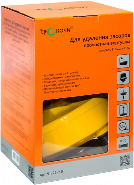 Вертушка для прочистки канализационных труб Крокочист 7 мм × 7,6 м (Crocochist 7 mm × 7,6 m) – самый эффективный и универсальный прочистной инструмент для удаления засоров в канализации и сточных трубах Ø до 50 мм, длиной до 7,6 м.